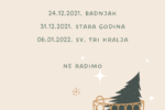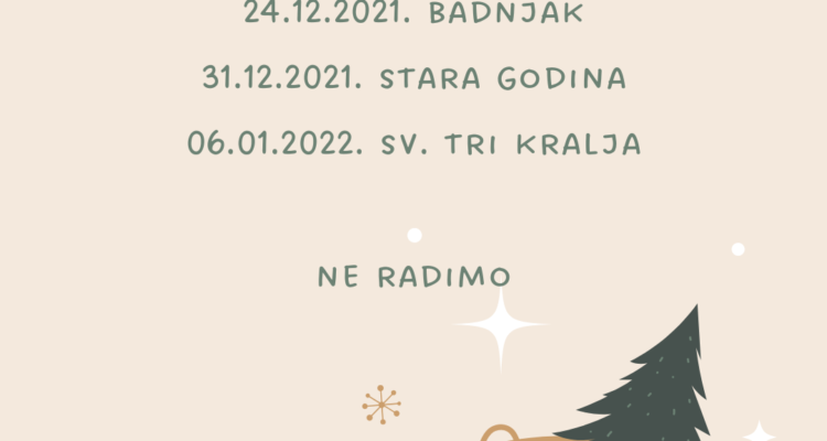 Poštovani članovi, Na Badnjak, Božić i blagdan Sv. Stjepana (24.-26.12.2021.), staru i Novu godinu (31.12.2021.-01.01.2022.) i blagdan Tri kralja (06.01.2022.) centar neće raditi. Propuštene treninge možete nadoknaditi u grupi po izboru. Sretan Božić i uspješnu Novu 2022. godinu želi Vam SuperBody!