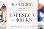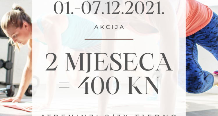 Dragi članovi, Prosinac je vrijeme darivanja i zato smo vam u periodu 01.-07.12.2021. pripremili posebnu akcijsku cijenu članarine: 2 MJESECA = 400 kuna Cijena se odnosi na članarinu za treninge 2/3x tjedno. Probni trening je besplatan, pridružite nam se! 🙂 * akcijsku članarinu nije moguće pauzirati